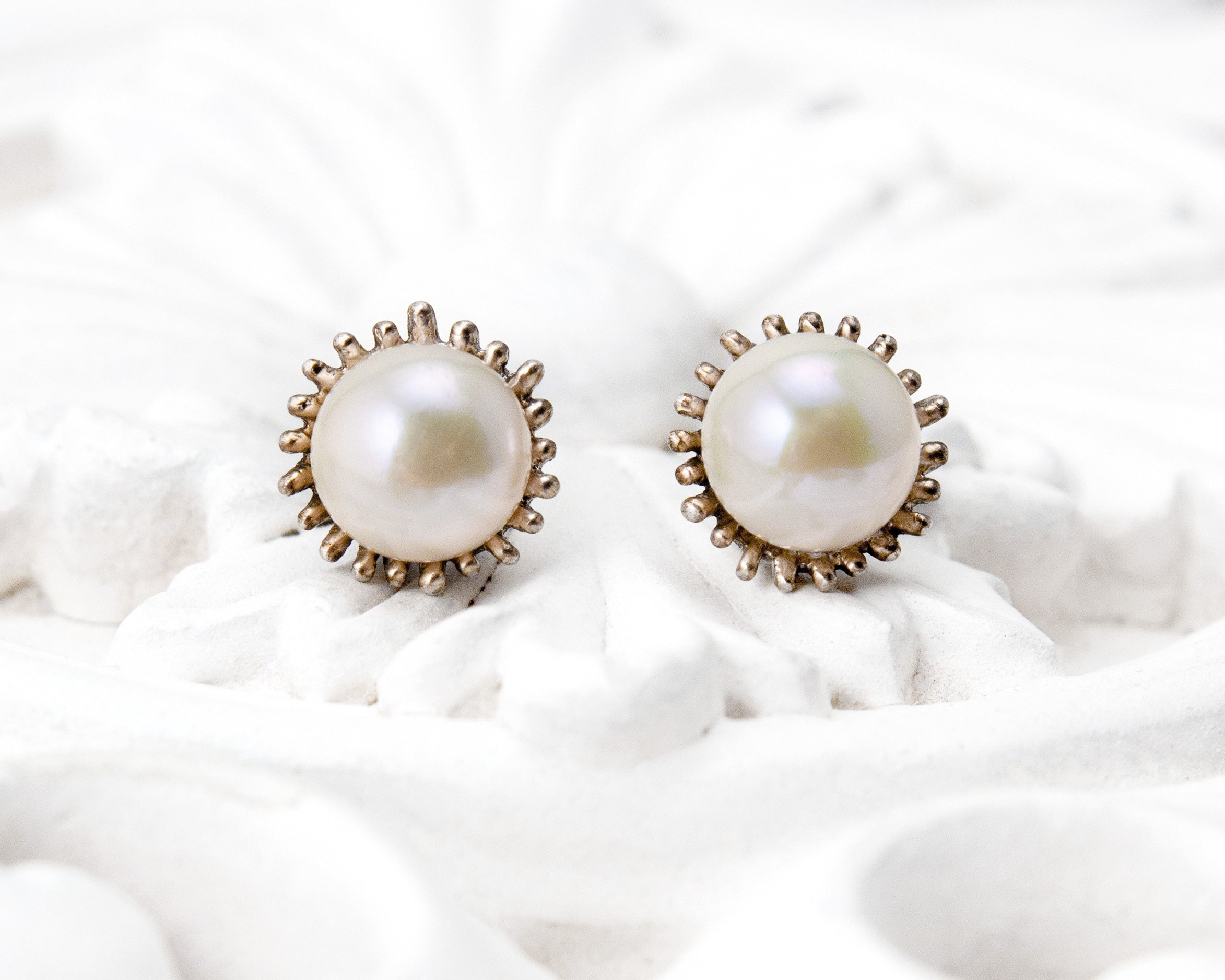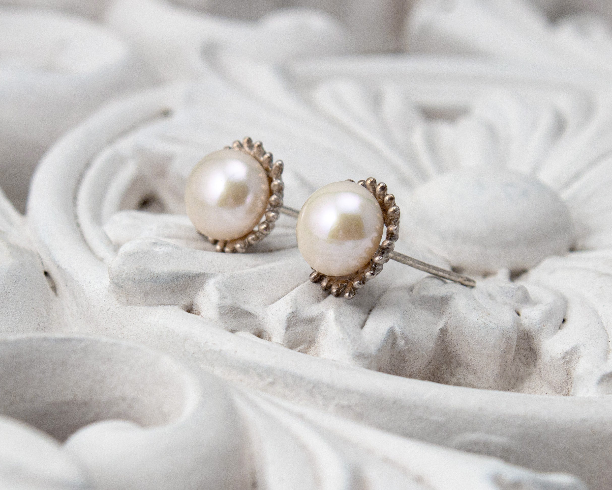 The Dahlia Studs offer a unique twist on classic pearl earrings. They feature two 7mm, freshwater button pearls cradled in a hand-carved, sterling silver setting. These will be your next go to earrings—a fantastic treasure for all occasions.