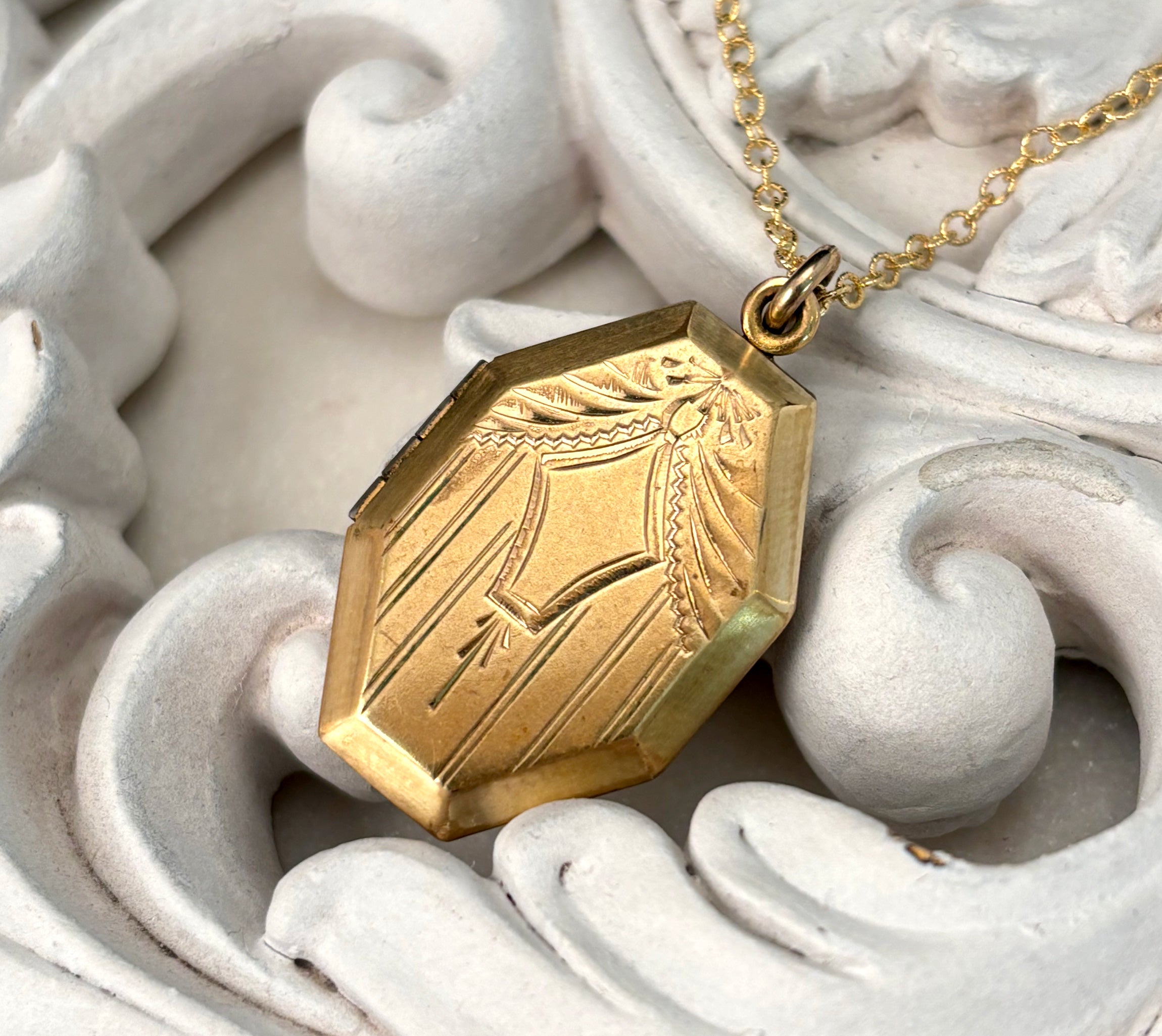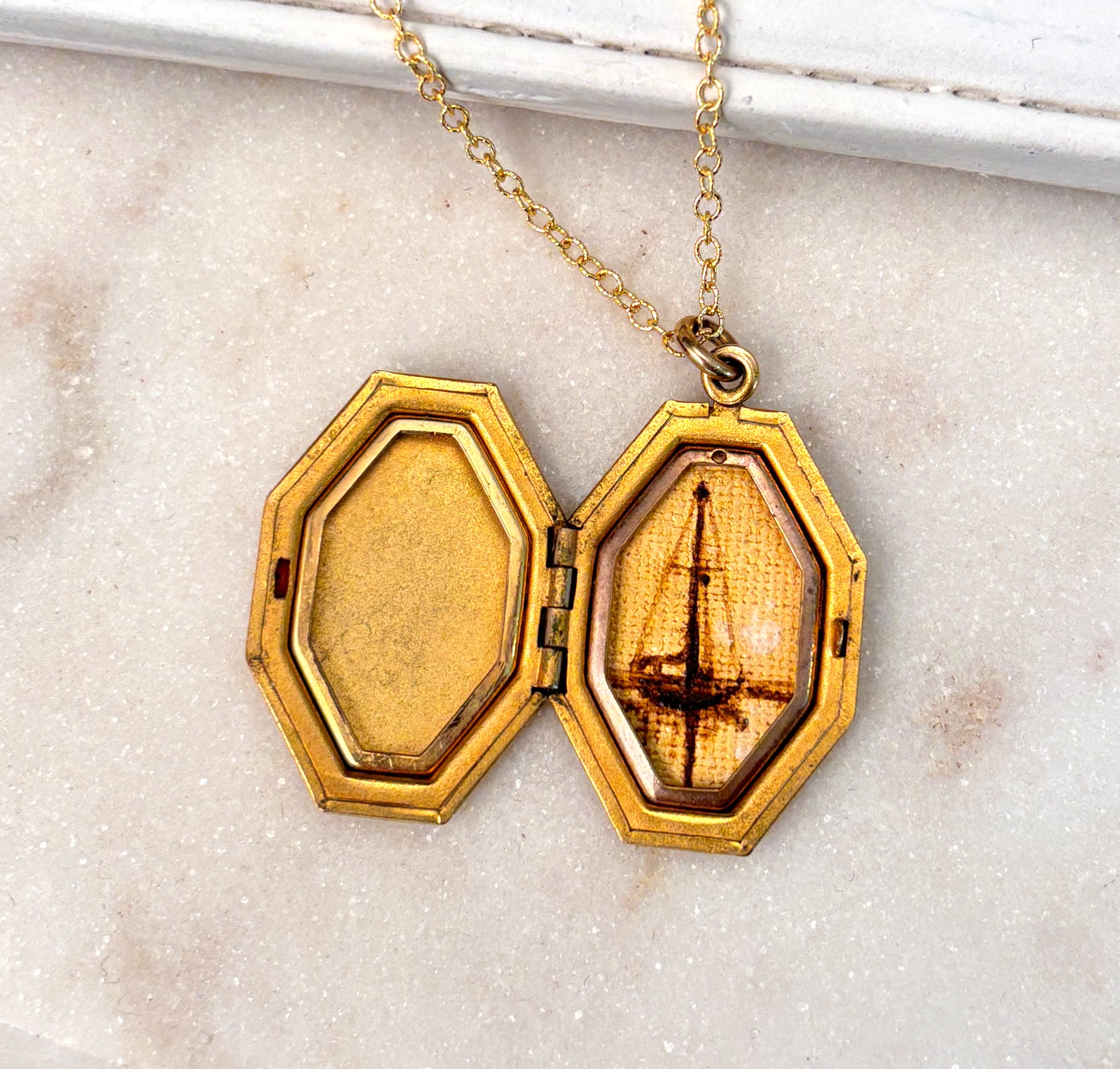 This gold-toned vintage locket features a delicate engraving on the front and a miniature oil painting of a tiny sailboat captured in warm, sepia tones. The opposite side is left blank for a personal photo or keepsake. Strung on an 18" gold-filled chain, it’s a sweet reminder of slow days, open water and the warmth of nostalgic summers.